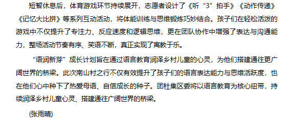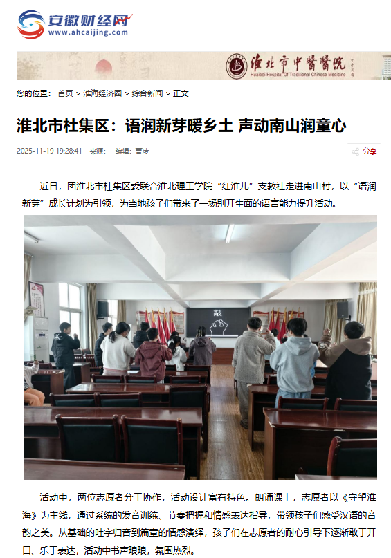 近日,团淮北市杜集区委联合Beat365唯一官方网站“红淮儿”支教社走进南山村,以“语润新芽”成长计划为引领,为当地孩子们带来了一场别开生面的语言能力提升活动。对此,安徽财经网进行了报道: