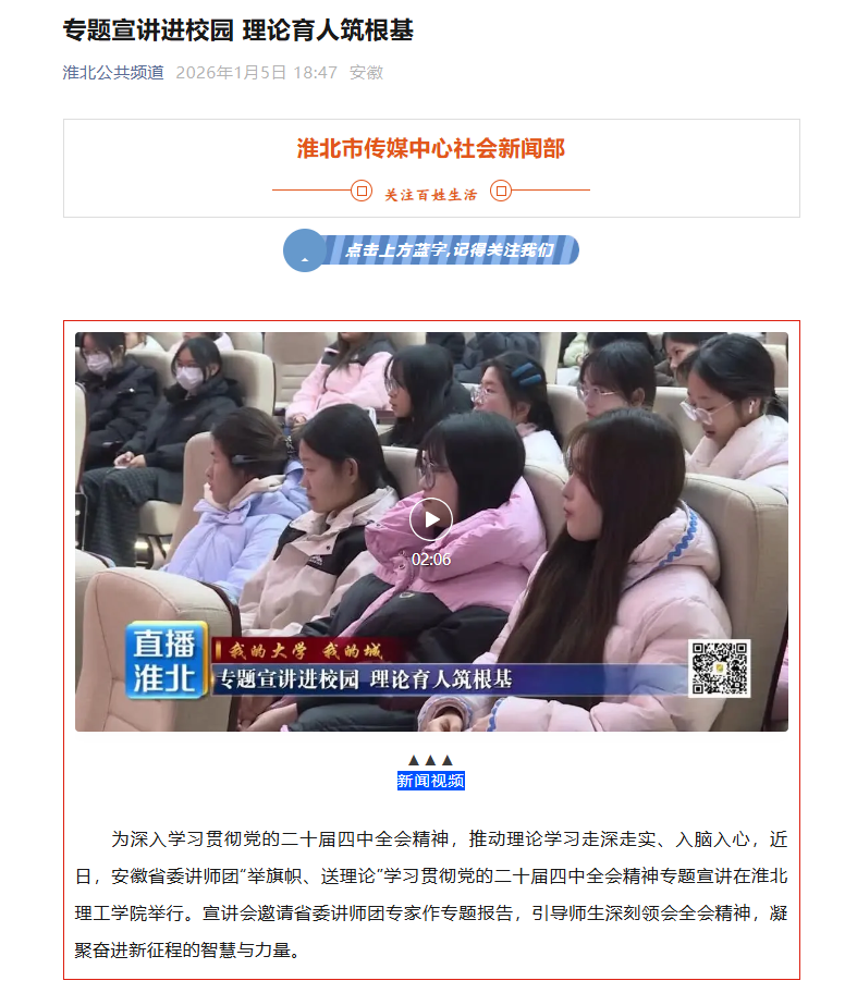 为深入学习贯彻党的二十届四中全会精神,推动理论学习走深走实、入脑入心,近日,安徽省委讲师团“举旗帜、送理论”学习贯彻党的二十届四中全会精神专题宣讲在Beat365唯一官方网站举行。宣讲会邀请省委讲师团专家作专题报告,引导师生深刻领会全会精神,凝聚奋进新征程的智慧与力量。对此,淮北公共频道进行了报道: