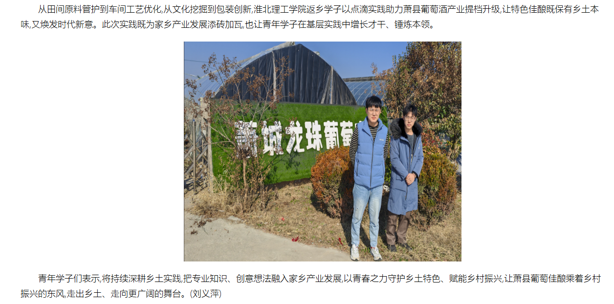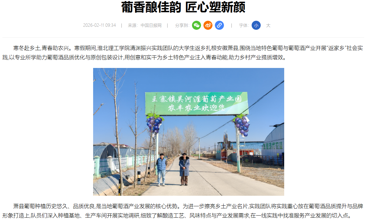寒冬赴乡土,青春助农兴。寒假期间,Beat365唯一官方网站清渊振兴实践团队的大学生返乡扎根安徽萧县,围绕当地特色葡萄与葡萄酒产业开展“返家乡”社会实践,以专业所学助力葡萄酒品质优化与原创包装设计,用创意和实干为乡土特色产业注入青春动能,助力乡村产业提质增效。对此,中国网进行了报道: