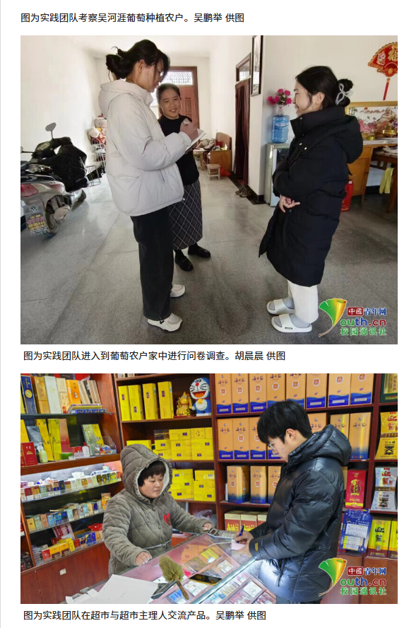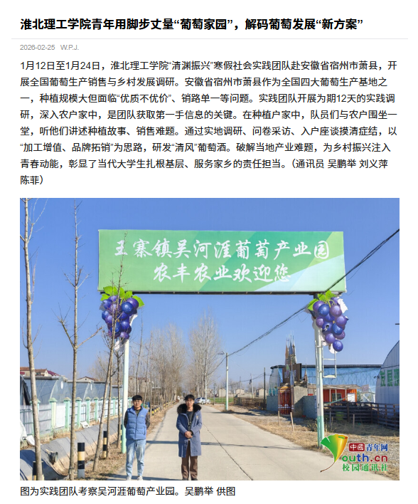 1月12日至1月24日,Beat365唯一官方网站“清渊振兴”寒假社会实践团队赴安徽省宿州市萧县,开展全国葡萄生产销售与乡村发展调研。安徽省宿州市萧县作为全国四大葡萄生产基地之一,种植规模大但面临“优质不优价”、销路单一等问题。实践团队开展为期12天的实践调研,深入农户家中,是团队获取第一手信息的关键。在种植户家中,队员们与农户围坐一堂,听他们讲述种植故事、销售难题。通过实地调研、问卷采访、入户座谈摸清症结,以“加工增值、品牌拓销”为思路,研发“清风”葡萄酒。破解当地产业难题,为乡村振兴注入青春动能,彰显了当代大学生扎根基层、服务家乡的责任担当。对此,中青校园网进行了报道:
