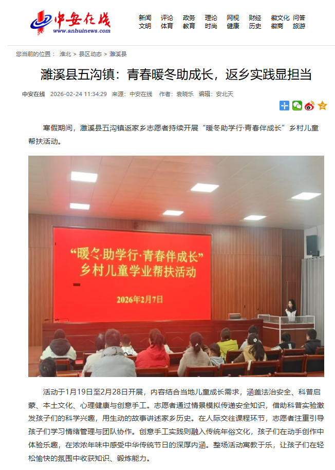 寒假期间,濉溪县五沟镇返家乡志愿者持续开展“暖冬助学行·青春伴成长”乡村儿童帮扶活动。对此,中安在线进行了报道: