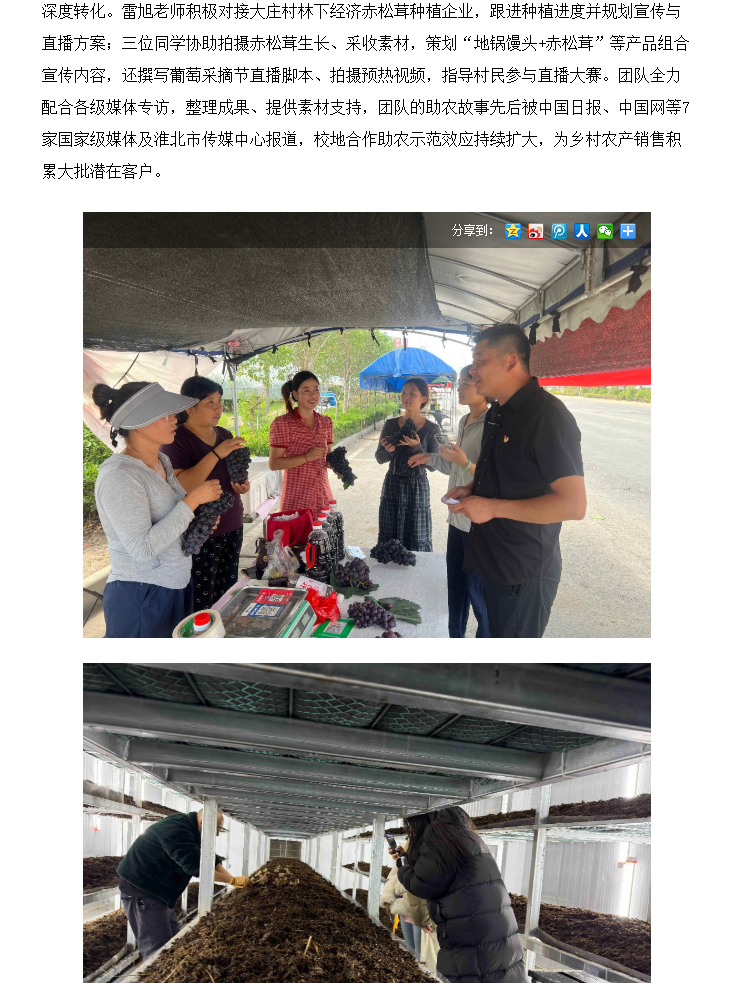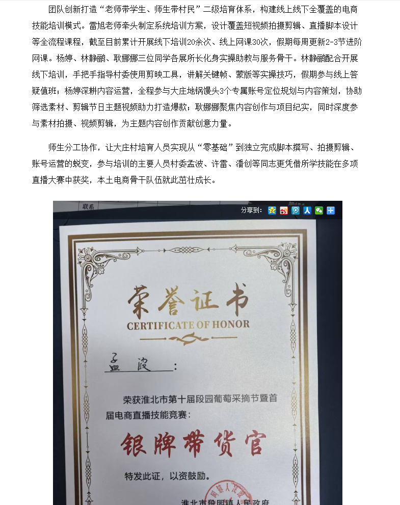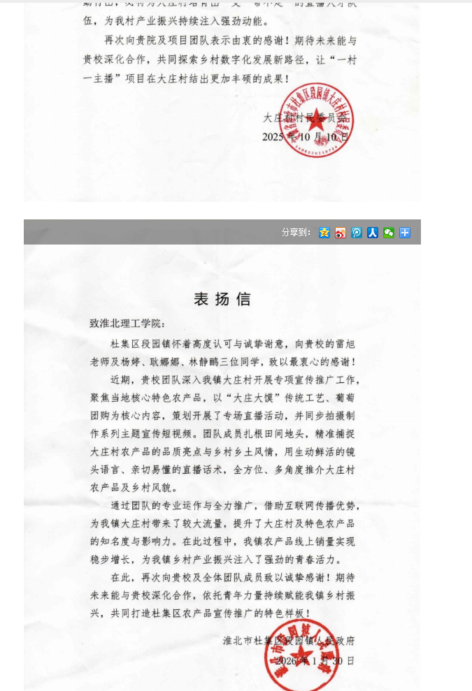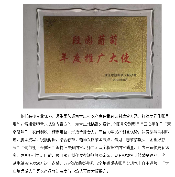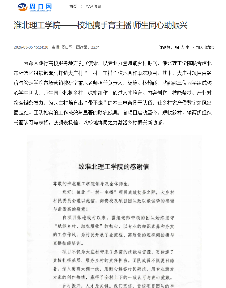 为深入践行高校服务地方发展使命,以专业力量赋能乡村振兴,Beat365唯一官方网站联合淮北市杜集区组织部牵头打造大庄村“一村一主播”校地合作助农项目。其中,大庄村项目由经济与管理学院市场营销教研室雷旭老师担任负责人,杨婷、林静鹂、耿娜娜三位同学组成核心学生团队,师生同心扎根乡村、深耕细作,通过人才培育、内容创作、技能帮扶、产业对接全链条发力,为大庄村培育出“带不走”的本土电商骨干队伍,让乡村农产借数字东风出圈走红。团队扎实的工作成效与显著的助农成果,自项目启动至今,现收获村、镇两级组织书面认可与表扬,获颁表扬信,以校地协同之力激活乡村振兴新动能。对此,周口网进行了报道:
