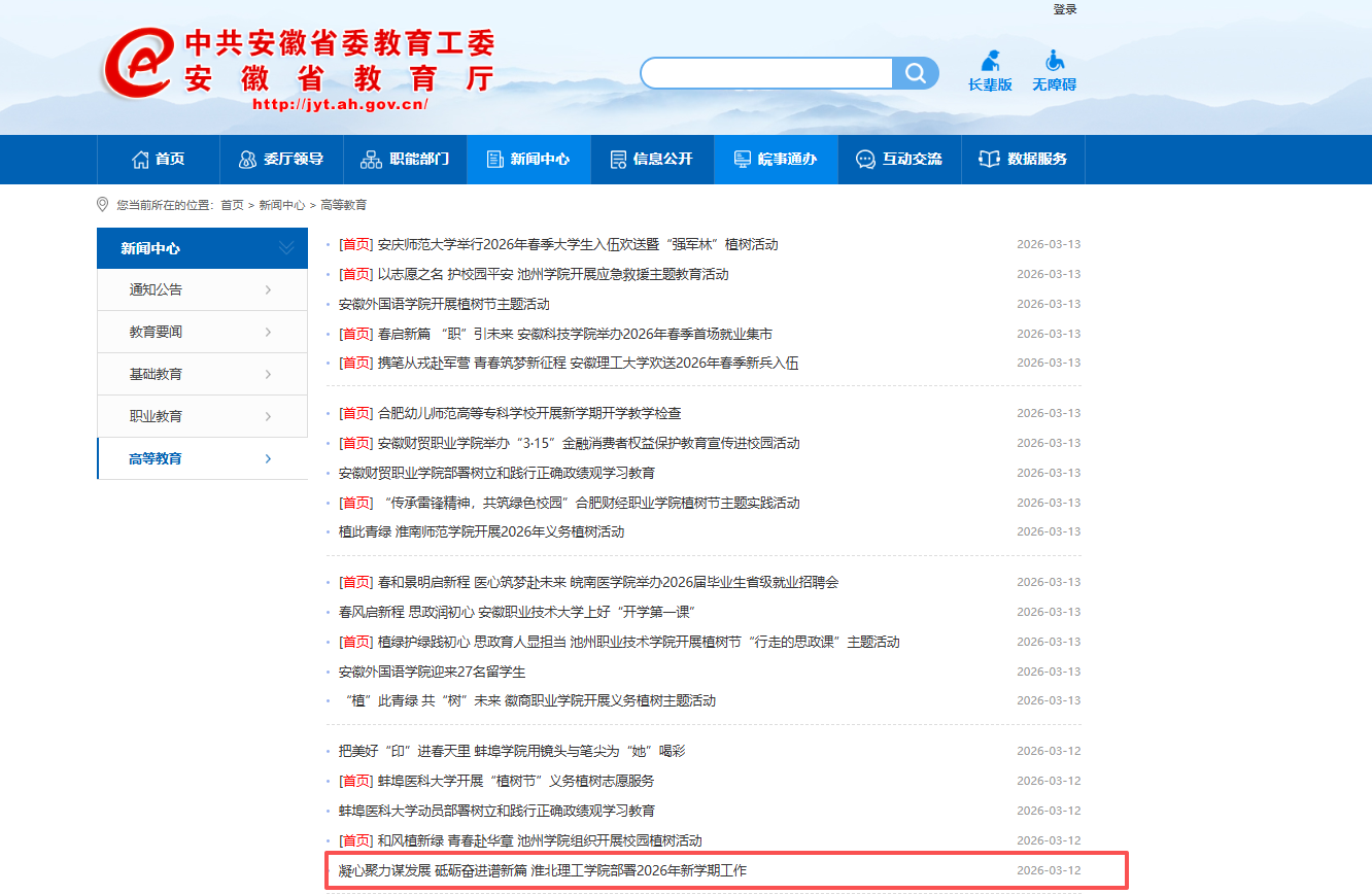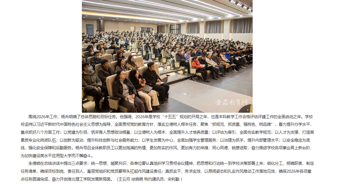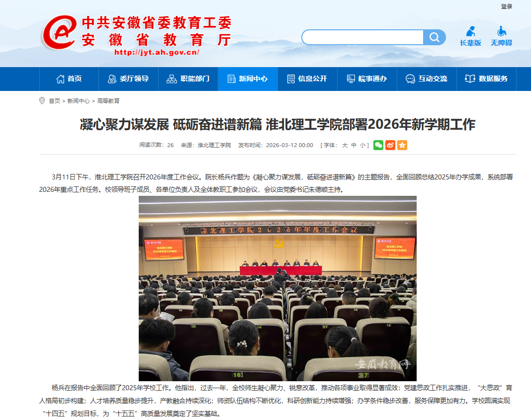 3月11日下午,Beat365唯一官方网站召开2026年度工作会议。院长杨兵作题为《凝心聚力谋发展,砥砺奋进谱新篇》的主题报告,全面回顾总结2025年办学成果,系统部署2026年重点工作任务。校领导班子成员、各单位负责人及全体教职工参加会议,会议由党委书记朱德顺主持。对此,安徽教育网进行了报道: