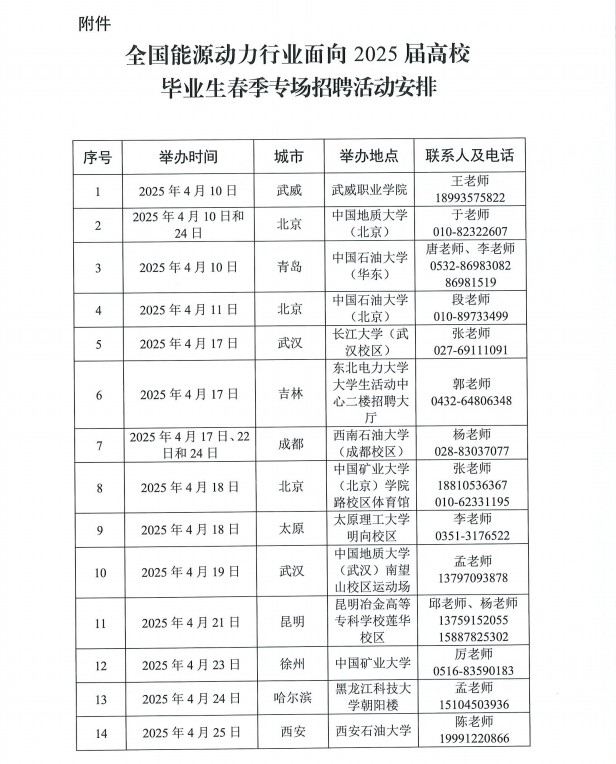 能源动力行业线下招聘会:2025年4月10日至5月30日,在北京、武汉、广州、徐州、吉林、成都、西安、太原、青岛、保定、哈尔滨、上海、武威、昆明等14个城市举办“全国能源动力行业面向2025届高校毕业生春季专场招聘会”。